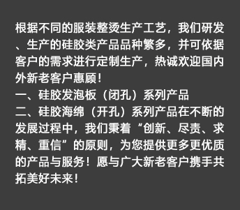 我公司生產(chǎn)的硅膠海綿(開孔)系列產(chǎn)品具有耐高溫、透氣性好、耐壓性強(qiáng)等優(yōu)點(diǎn),是西服及高檔服裝整燙生產(chǎn)的必備產(chǎn)品。硅膠發(fā)泡板(閉孔)系列產(chǎn)品具有發(fā)泡均勻,耐高溫、耐壓性能好,其中新研制開發(fā)的針孔浮點(diǎn)硅膠發(fā)泡板攻克了一般產(chǎn)品的浮點(diǎn)不飽滿的技術(shù)難題,一般產(chǎn)品的浮點(diǎn)不飽滿,容易擋住透氣孔,造成吸風(fēng)效果不良。我司的產(chǎn)品具有更好的透氣性和回彈性,以及更長(zhǎng)時(shí)間的試用壽命。